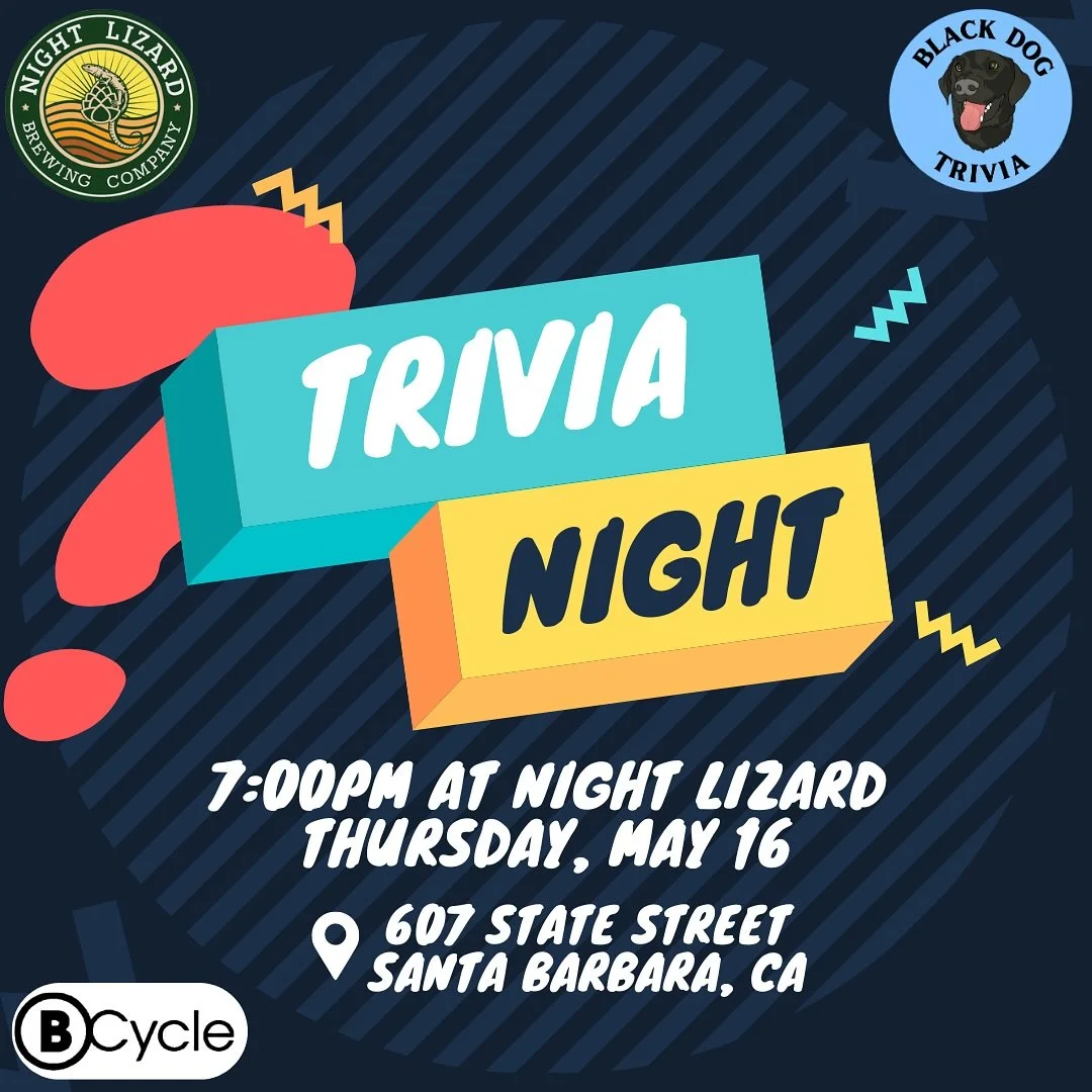 General Trivia, sponsored by BCycle Thursday, May 16, 2024 7:00 PM 9:30 PM Night Lizard Brewing 607 State Street Santa Barbara, CA, 93101 United States (map) Google Calendar ICS View fullsize Know a Little About a Lot?Come join Black Dog Trivia and test out your General Trivia knowledge (sponsored by BCycle) with friends and other members of your community! Win prizes, grab a brew, and build connections!
